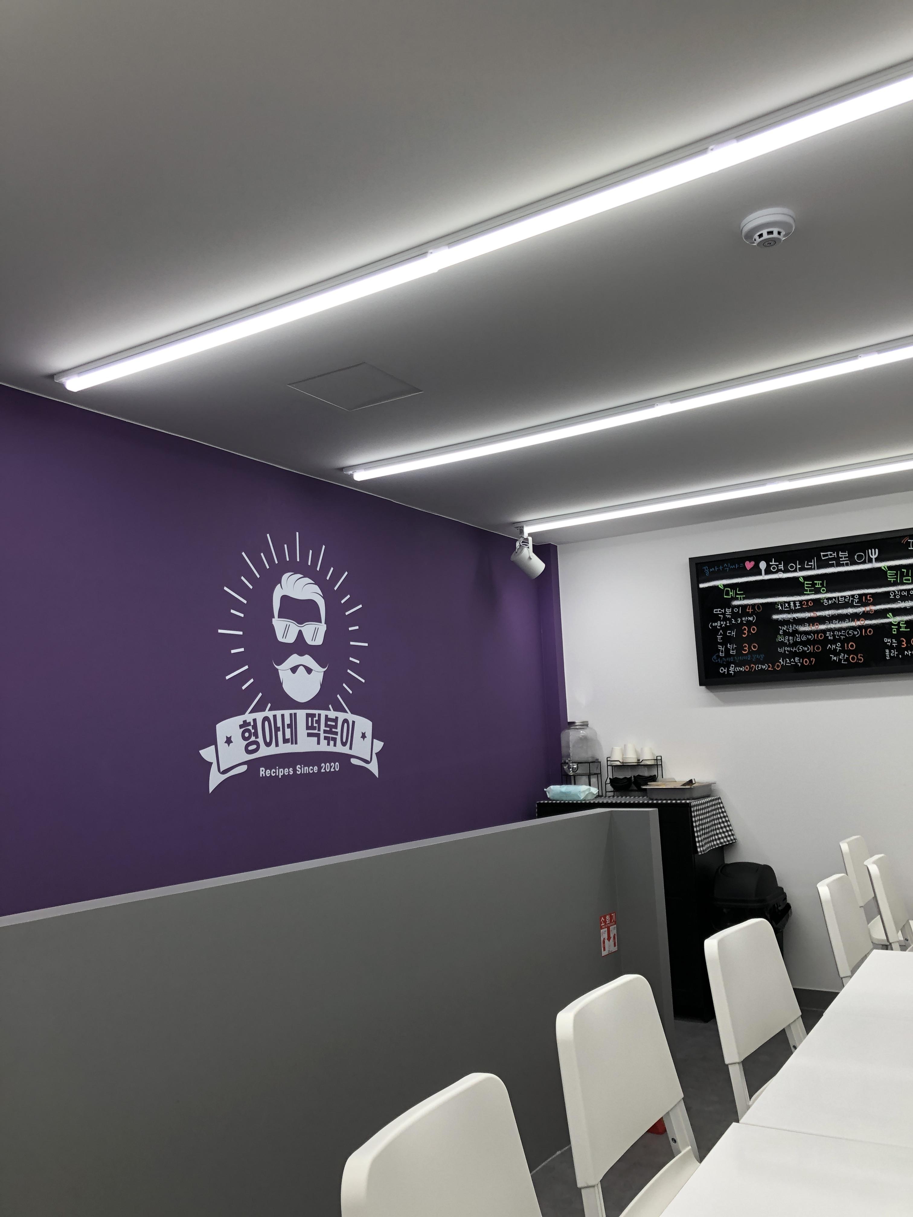 2층에 올라왔더니 형아네 떡볶이 캐릭터가 크게 그려진 연보라색 벽이 있어요